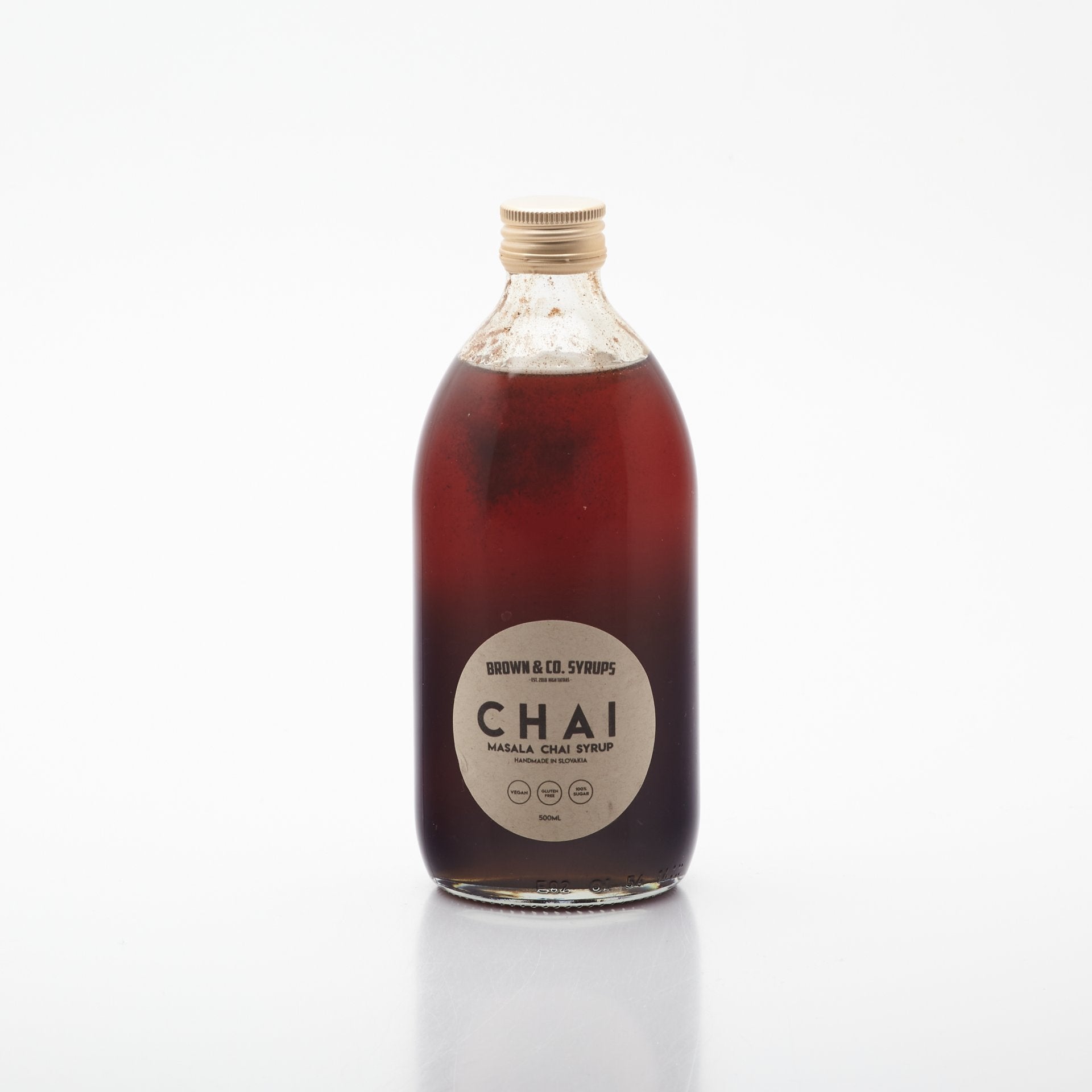 Signature sirup BROWN&Co. Vychádza z indického čajového nápoja masala chai, ktorý v sebe kombinuje základ z čierneho čaju a mixu korení v ktorom dominuje kardamón, zázvor a škorica. Zloženie: voda, cukor, čierny čaj, kardamón, zázvor, škorica, badyán, čierne korenie, klinčeky
